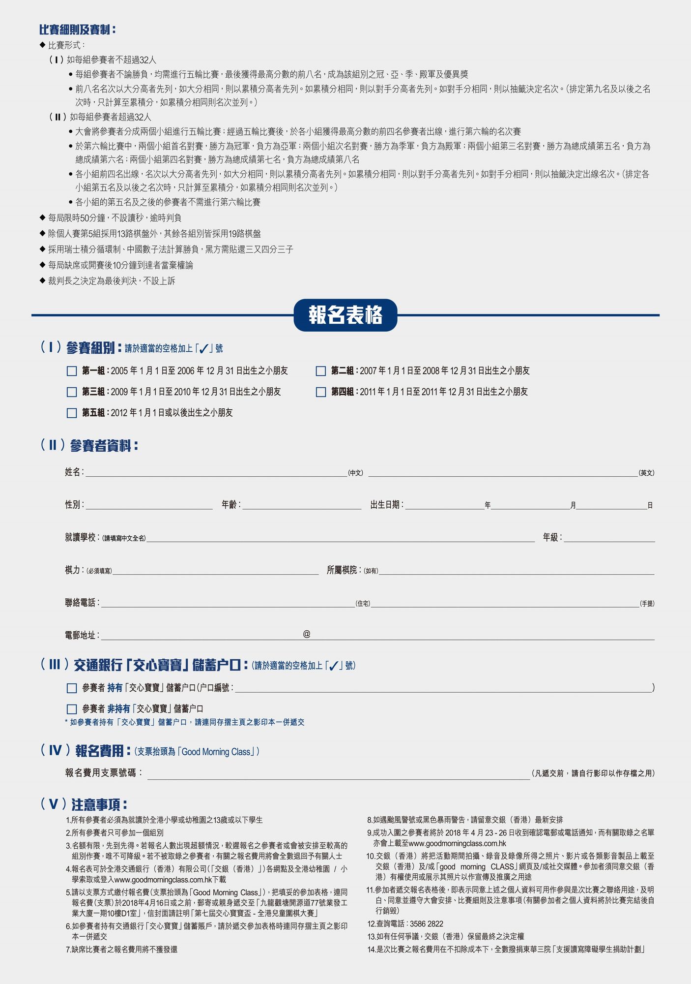 由「交通銀行」主辦、「good morning CLASS」協辦之「第七屆交心寶寶盃 - 全港兒童圍棋大賽」,將於2018年4月29日(星期日)假荃灣D‧PARK 愉景新城L1 中庭舉行,每個組別之參賽者名單亦誕生,大會將個別以電郵方式通知各參賽者有關比賽詳情及報到時間,敬請各參賽者注意。
